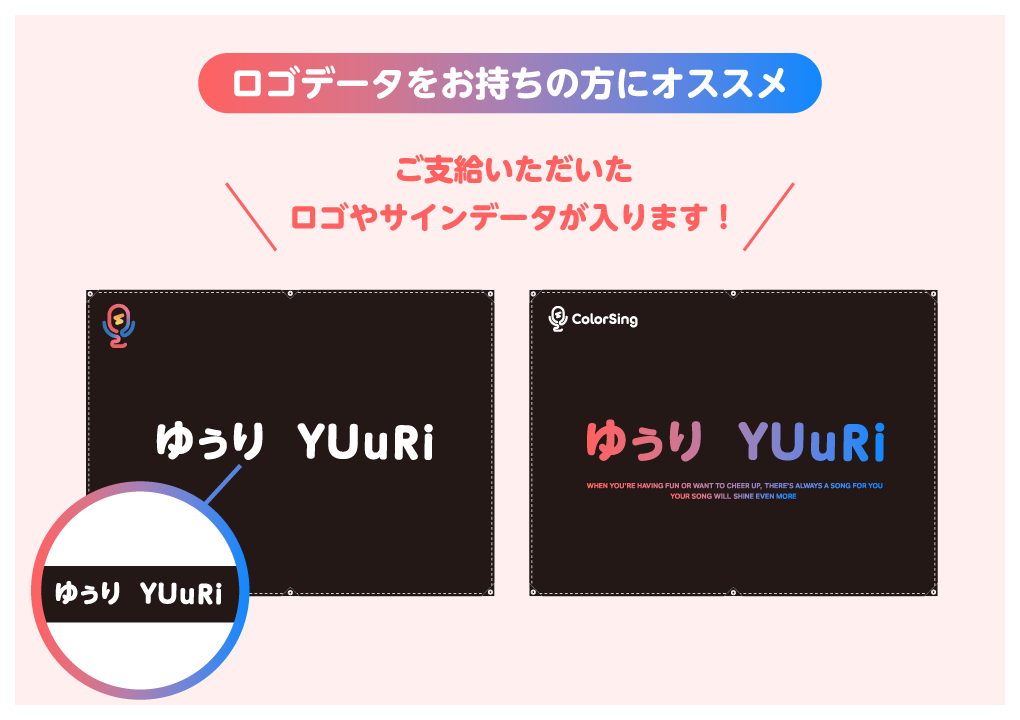 ※画像内にある「ゆぅり YUuRi」「ゆぅり YUuRi ~英文~」は、提出いただいたロゴデータもしくはサインデータの名入れ場所に対応しています。